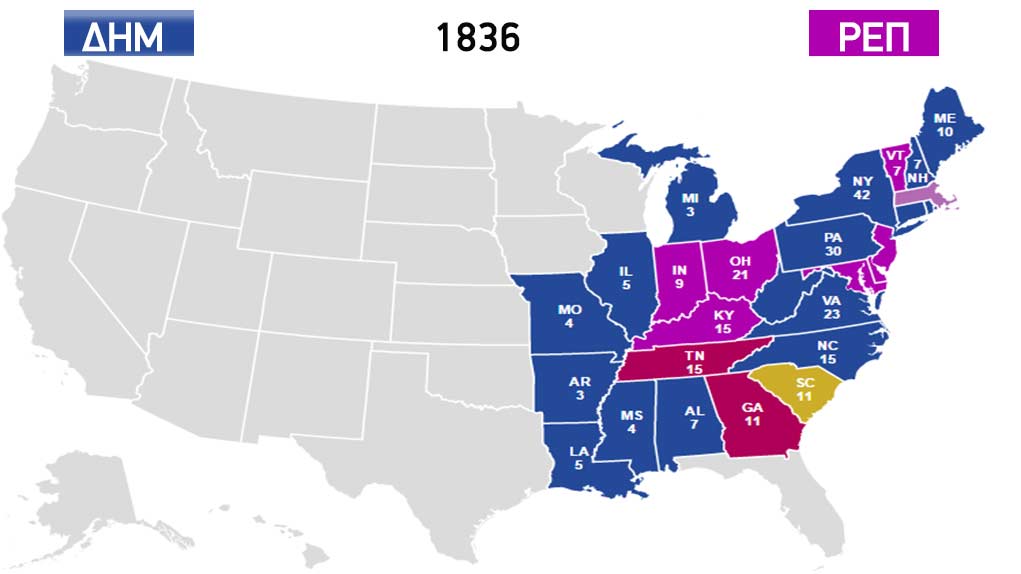 1836 Εκλογές 1836. Οι Δημοκρατικοί νικούν πάλι με τον Μάρτιν Βάν Μπιούρεν αλλά αυξάνεται η πίεση από τούς Γουίγκς (Whigs) που δύο χρόνια πριν προήλθε από μέλη του Εθνικών Δημοκρατών (National Republicans) και του κόμματος των Αντι-μασόνων. Η ήττα των Γουίγκς οφείλεται στη συμμετοχή τους στις εκλογές με πολλούς υποψηφίους. Στις εκλογές συμμετέχουν δύο νέες πολιτείες το Αρκάνσας και το Μίσιγκαν.