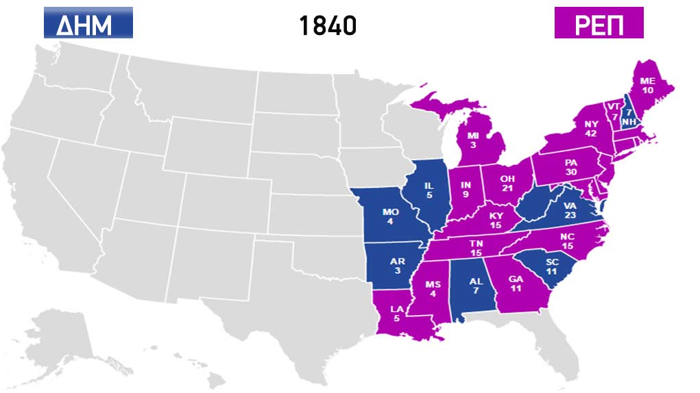 1840 Εκλογές 1840. Η πρώτη νίκη του ριζοσπαστικού κόμματος Γουίγκ του πρόγονου του Ρεπουμπλικανικού, με τον Γουίλιαμ Χάρισον που αγωνίστηκε κατά του τότε κατεστημένου των Δημοκρατικών. Η νίκη οφείλεται στο ότι οι Γουίγκς κατέβηκαν ενωμένοι και στο ότι οι Δημοκρατικοί χρεώθηκαν την οικονομική ύφεση. Ο αριθμός των πολιτειών παραμένει στις 26.