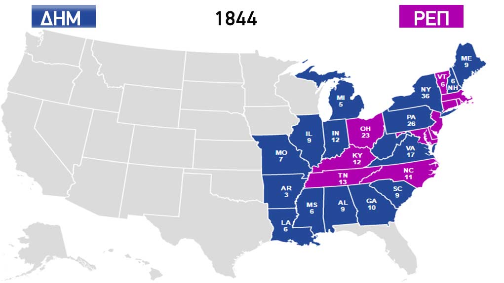 1844 Εκλογές 1844. Νικά το Δημοκρατικό κόμμα με τον Τζέιμς Πόλκ με σύνθημα την προσάρτηση στις Ηνωμένες Πολιτείες και άλλων περιοχών υπέρ της δουλείας όπως το Τέξας (αποσχισθέν από το Μεξικό), ενώ οι Γουίγκς είναι αντίθετοι στην προσάρτηση (και στη δουλεία). Είναι οι τελευταίες εκλογές που διενεργούνται σε διαφορετική μέρα στις διάφορες πολιτείες.