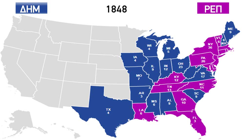 1848 Εκλογές 1848. Νικούν οι Γουίγκς κατηγορώντας την φιλοπολεμική (κατά του Μεξικού) και φιλορατσιστική (υπέρ της δουλείας) πολιτική των Δημοκρατικών αν και στο τέλος χρίζουν υποψήφιό τους τον Ζάκαρι Τέιλορ, ήρωα του αμερικανομεξικανικού πολέμου. Ψηφίζουν οι νέες πολιτείες Τέξας, Φλόριντα, Αϊόβα, και Ουισκόνσιν. Ορίζεται ενιαία μέρα διενέργειας των εκλογών “η Τρίτη μετά την πρώτη Δευτέρα του Νοεμβρίου”.