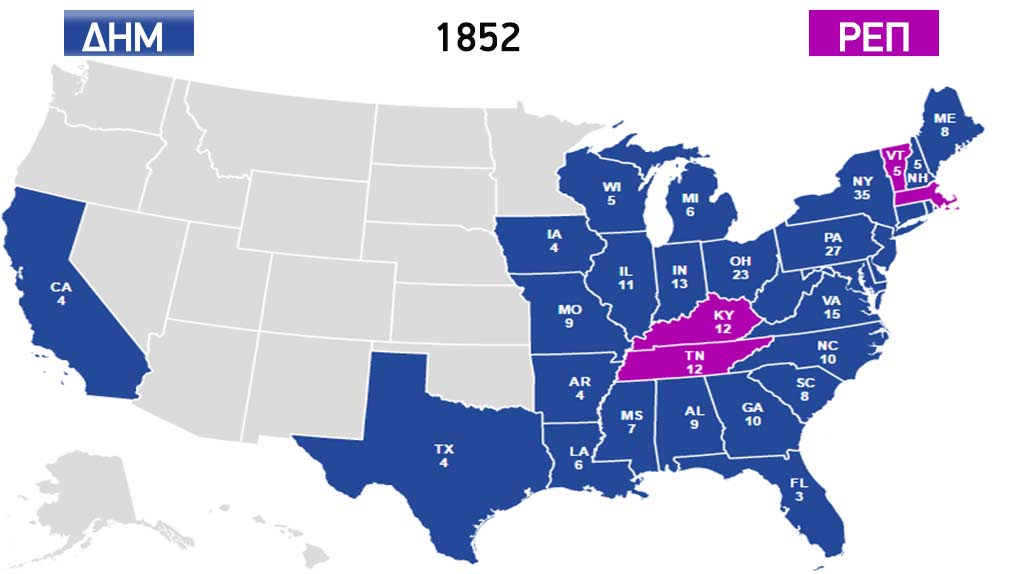 1852 Εκλογές 1852. Σημαντική νίκη των Δημοκρατικών με τον Φράνκλιν Πιρς καθώς οι Γουίγκς σπαράσσονται από εσωτερικές γεωγραφικές έριδες πάνω στο θέμα της δουλείας με τελικό αποτέλεσμα την διάλυση του κόμματος και την μετεξέλιξή του στο σημερινό Ρεπουμπλικανικό κόμμα. Η περιοχή της Καλιφόρνιας εντάσσεται ως νέα πολιτεία και ψηφίζει.
