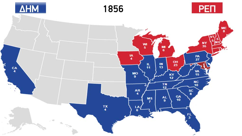 1856 Εκλογές 1856. Νικούν οι Δημοκρατικοί με τον Τζέιμς Μπιουκάναν μέσα σε ένα έντονα φορτισμένο κλίμα όπου το νέο Ρεπουμπλικανικό κόμμα, που κατεβαίνει στις εκλογές διασπασμένο, καταφέρεται εναντίον της εξάπλωσης της δουλείας ενώ παράλληλα οι Δημοκρατικοί κατηγορούν τους Ρεπουμπλικανούς ως εξτρεμιστές που εάν νικήσουν θα οδηγήσουν τη χώρα σε εμφύλιο πόλεμο.
