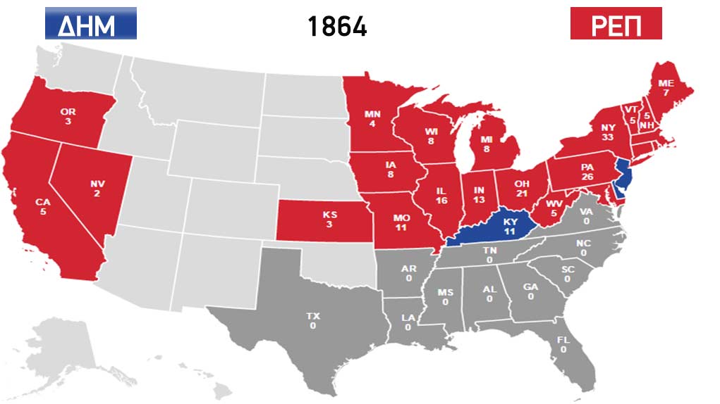 1864 Εκλογές 1864. Νίκη των Ρεπουμπλικανών με τον Λίνκολν, μεσούντος του Εμφυλίου, χωρίς βέβαια την συμμετοχή των 11 νότιων πολιτειών (Αλαμπάμα, Φλόριδα, Αρκάνσας, Τζόρτζια, Λουιζιάνα, Μισισίπι, Βόρεια Καρολίνα, Νότια Καρολίνα, Τενεσί, Τέξας και Βιρτζίνια (προπύργια των Δημοκρατικών). Δολοφονία του Λίνκολν στις 15 Απριλίου 1865. Μετά τη δολοφονία, ορκίστηκε Πρόεδρος ο αντιπρόεδρός του (Δημοκρατικός) Αντριου Τζόνσεν. Νέες πολιτείες Κάνσας, Δυτική Βιρτζίνια, Νεβάδα.