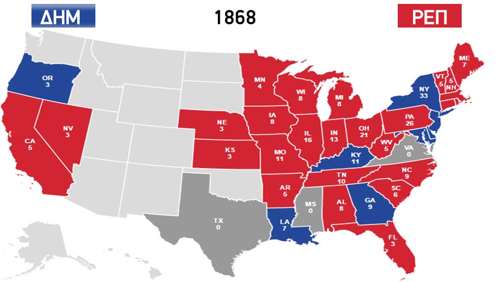 1868 Εκλογές 1868. Εύκολη νίκη των Ρεπουμπλικανών στις πρώτες εκλογές μετά τον Εμφύλιο (1865) με τον ήρωα του πολέμου στρατηγό Οδυσσέα Γκράντ. Τρείς νότιες πολιτείες, Τέξας, Μισισίπι και Βιρτζίνια παρέμεναν ακόμα αποσχισμένες και δεν συμμετείχαν στις εκλογές. Περίοδος ανασυγκρότησης αλλά και μετεμφυλιακών ξεκαθαρισμάτων. Νέα πολιτεία Νεμπράσκα.