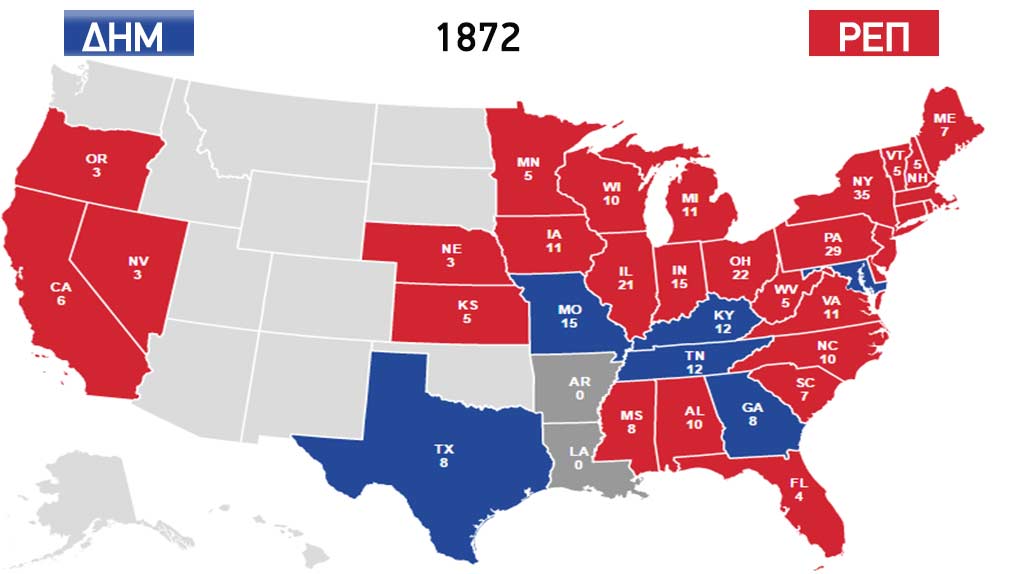 1872 Εκλογές 1872. Εύκολη επανεκλογή του Οδυσσέα Γκράντ και των νικητών του Εμφυλίου Ρεπουμπλικανών με αντίπαλο ένα αποσχισθέν Ρεπουμπλικανό Κόμμα (Liberal Republicans) που ψήφισαν και οι Δημοκρατικοί καθώς δεν συμμετείχε στις εκλογές το Δημοκρατικό Κόμμα. Οι δύο νότιες πολιτείες Αρκάνσας και Λουιζιάνα δεν ψήφισαν καθόλου. Αρχίζουν τα πρώτα φαινόμενα διαφθοράς στις Ρεπουμπλικανικές κυβερνήσεις.
