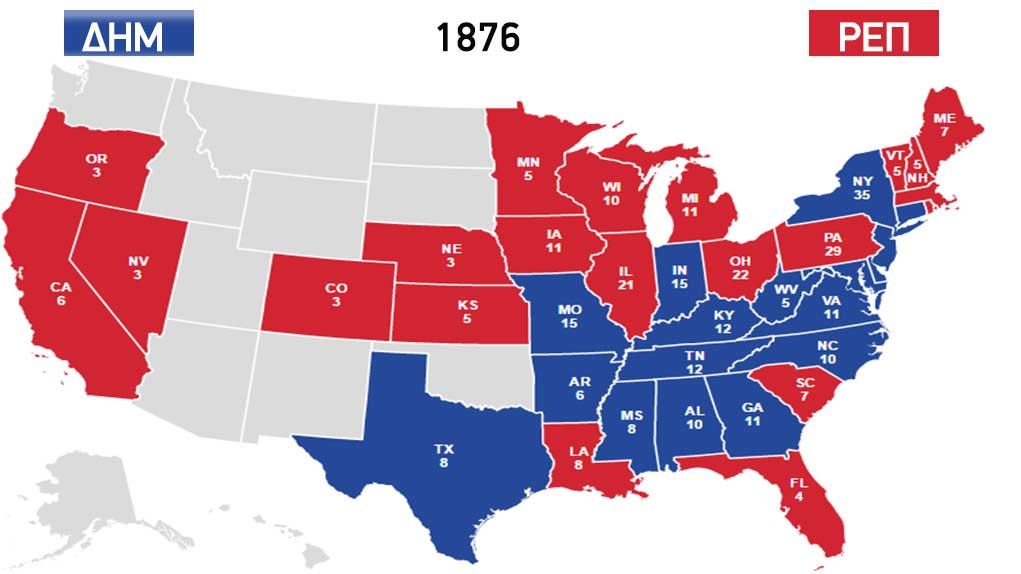 1876 Εκλογές 1876. Από τις πιο αμφιλεγόμενες εκλογές στην ιστορία των ΗΠΑ. Τις κέρδισε τελικά το Ρεπουμπλικανικό κόμμα που και λιγότερες ψήφους πολιτών έλαβε αλλά και οι 20 κρίσιμοι εκλέκτορες που πιθανόν θα έπαιρνε το Δημοκρατικό κόμμα μετρήθηκαν υπέρ του Ρεπουμπλικανού υποψήφιου (Χέιζ) μετά μια πιθανολογούμενη συμφωνία προκειμένου να αποχωρήσει ο ομοσπονδιακός στρατός (κατοχής) από το Νότο. Νέα πολιτεία το Κολοράντο.