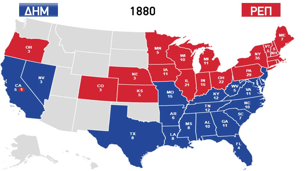 1880 Εκλογές 1880. Και πάλι οριακή νίκη των Ρεπουμπλικανών, η με μικρότερη διαφορά στις ψήφους των πολιτών μέχρι σήμερα. Ουσιαστικά οι εκλογές αυτές ήταν ένα πολιτικό δημοψήφισμα για την λήξη της «καταπίεσης» των Νότιων από τους Βόρειους, και ένα οικονομικό δημοψήφισμα για τους δασμούς. Οι Ρεπουμπλικανοί ήθελαν υψηλούς δασμούς για να προστατεύονται οι αμερικανικές επιχειρήσεις ενώ οι Δημοκρατικοί χαμηλούς.
