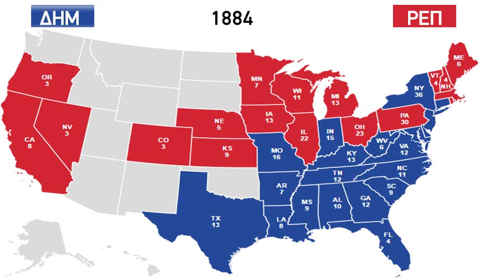 1884 Εκλογές 1884. Σχεδόν μετά 25 χρόνια παντοδυναμίας των Ρεπουμπλικανών οι Δημοκρατικοί κερδίζουν οριακά τις εκλογές (τελευταία φορά είχαν κερδίσει το 1956) με μικρή διαφορά στη λαϊκή ψήφο, με τον κυβερνήτη της Νέας Υόρκης Γκρόβερ Κλίβλαντ. Οι εκλογές αυτές χαρακτηρίστηκαν από τις χαμηλού επιπέδου προσωπικές αντεγκλήσεις των υποψηφίων.