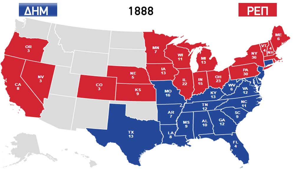 1888 Εκλογές 1888. Οριακά κερδίζουν τις εκλογές οι Ρεπουμπλικανοί με τον Χάρισον παρόλο που παίρνουν λιγότερες ψήφους των πολιτών. Οι εκλογές που βγήκε άλλο κόμμα από αυτό που ψήφισε η πλειοψηφία των πολιτών (λόγω πλειοψηφικού συστήματος των εκλεκτόρων) είναι 4 (1824, 1876, 1888, 2000). Διαμάχη για την οικονομία. Υπέρ του ελεύθερου εμπορίου οι Δημοκρατικοί, υπέρ του προστατευτισμού οι Ρεπουμπλικανοί.