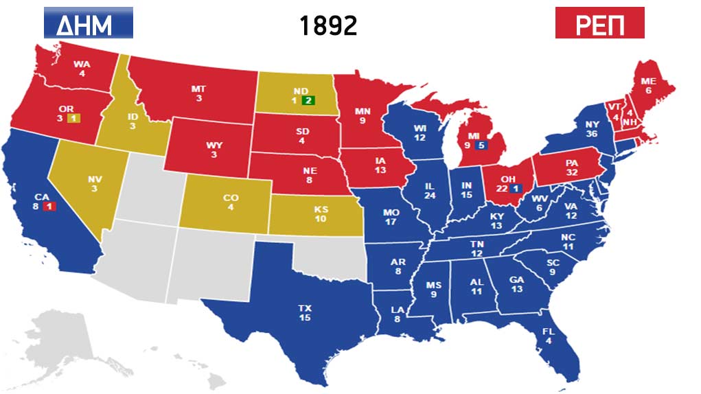 1892 Εκλογές 1892. Κερδίζουν οι Δημοκρατικοί πάλι με τον Κλίβλαντ. Η οικονομία και πάλι το πεδίο αντιπαράθεσης. Δημοκρατικοί υπέρ ισχυρού νομίσματος με βάση το κανόνα χρυσού και υπέρ λιγότερου προστατευτισμού και Ρεπουμπλικανοί υπέρ ενισχυμένου προστατευτισμού και λιγότερου ισχυρού νομίσματος με βάση κανόνα χρυσού και ασημιού. Νέες πολιτείες Άϊνταχο, Μοντάνα, Βόρεια Ντακότα, Νότια Ντακότα, Ουάσιγκτον και Ουαϊόμινγκ.
