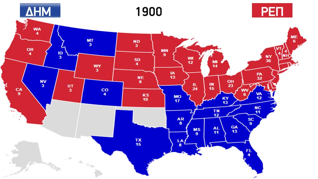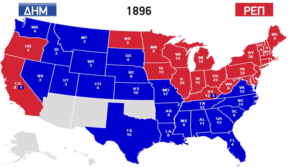 1896 Εκλογές 1896. Κερδίζουν οι Ρεπουμπλικανοί με τον Μακίνλι του οποίου η αναπτυξιακή οικονομική πολιτική οδηγεί την αμερικανική οικονομία για την επόμενη 20ετία και κάνει τη πρώτη στροφή των Ρεπουμπλικανών προς αυτό που είναι σήμερα. Αλλά και ο ηττημένος Δημοκρατικός Μπράιαν σπρώχνει το δεξιό Δημοκρατικό κόμμα προς το κέντρο που θα συνεχίσουν αργότερα ο Ρούσβελτ, ο Κένεντι και ο Τζόνσον. Νέα πολιτεία η Γιούτα.