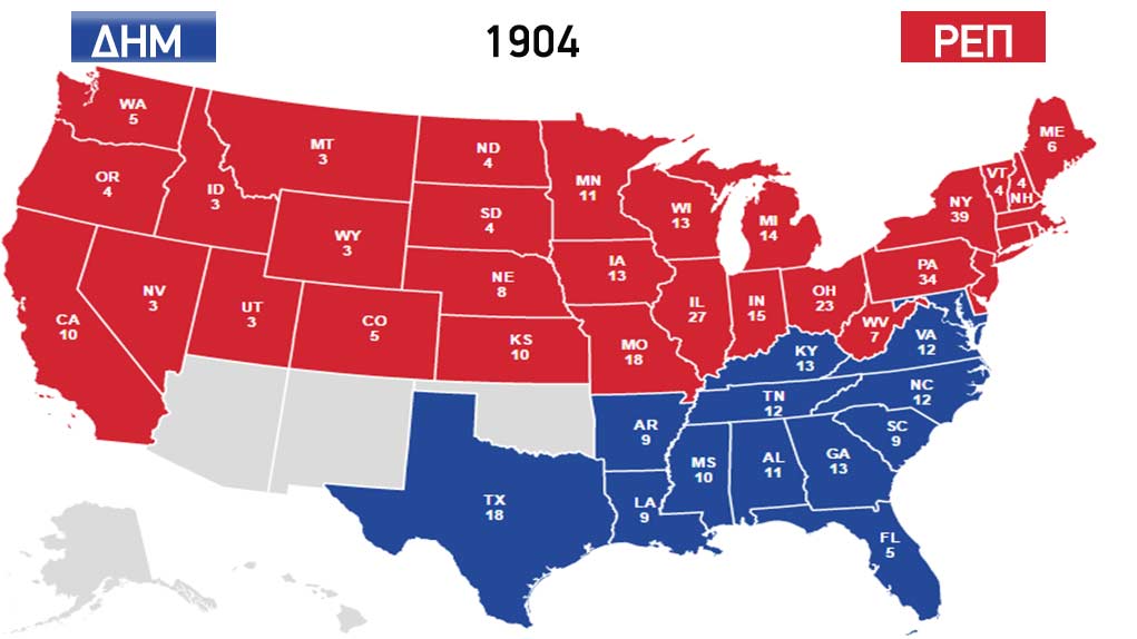 1904 Εκλογές 1904. Κερδίζουν εύκολα με μεγάλη διαφορά οι Ρεπουμπλικανοί με τον Θ. Ρούζβελτ (εξαιρουμένου βέβαια του Νότου που σχεδόν σύσσωμος ψήφισε Δημοκρατικούς), λόγω της επιτυχίας τους στην εξωτερική πολιτική και την ενίσχυση της οικονομίας κατά των μονοπωλίων. Οι Δημοκρατικοί υποστήριζαν την ανεξαρτησία των Φιλιππίνων και την χαλάρωση του προστατευτισμού, ενώ πρώτοι κάνουν προκριματικές εκλογές για τη εκλογή εκλεκτόρων (Φλόριντα).