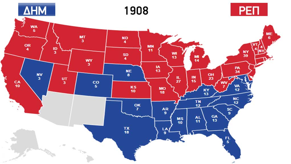 1908 Εκλογές 1908. Ακόμα μια νίκη των Ρεπουμπλικανών με τον Ταφτ παρά το γεγονός ότι οι Δημοκρατικοί έκαναν μια εντυπωσιακή προεκλογική καμπάνια κατά της ελίτ επιχειρηματικής τάξης των Ρεπουμπλικανών με αφορμή την χρηματιστηριακή και τραπεζική κρίση του 1907 και την πτώση των αξιών κατά 50%. Για τον Γουίλιαμ Μπράιαν των Δημοκρατικών αυτή ήταν η χειρότερη ήττα του στις τρεις τελευταίες εκλογές. Νέα πολιτεία η Οκλαχόμα.