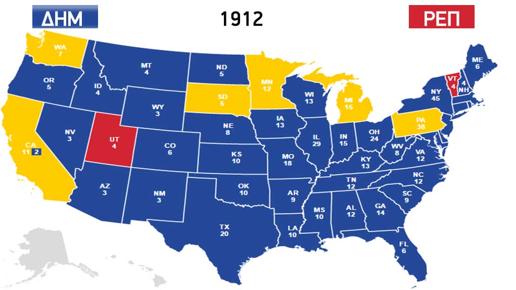 1912 Εκλογές 1912. Μεγάλη νίκη των Δημοκρατικών (λόγω και της διάσπασης των Ρεπουμπλικανών με τον πρώην Πρόεδρο Ρούζβελτ να ιδρύει δικό του κόμμα) με τον Γούντρο Γουίλσον τον μόνο Δημοκρατικό πρόεδρο από το 1892 έως το 1932. Είναι ο δεύτερος Δημοκρατικός πρόεδρος μαζί με τον Κλίβλαντ από το 1860 έως 1932. Μόνο δύο Δημοκρατικοί πρόεδροι (με 2 θητείες ο καθένας) μέσα σε 72 χρόνια. Με τις νέες πολιτείες Αριζόνα και Νέο Μεξικό οι ΗΠΑ γίνονται ενιαία χώρα με 48 πολιτείες.