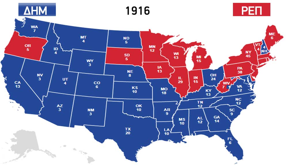 1916 Εκλογές 1916. Νέα νίκη των Δημοκρατικών πάλι με τον Γουίλσον, κυρίως λόγω της πολιτικής της μη ανάμιξης τόσο στον ευρωπαϊκό Α’ Παγκόσμιο Πόλεμο όσο και στην Μεξικανική Επανάσταση. Κύριο σύνθημα της καμπάνιας των Δημοκρατικών για τον Γουίλσον ‘Μας κράτησε μακριά από το πόλεμο’, παρά το γεγονός ότι το κοινό αίσθημα ήταν υπέρ των Αγγλογάλλων και κατά των Γερμανών.