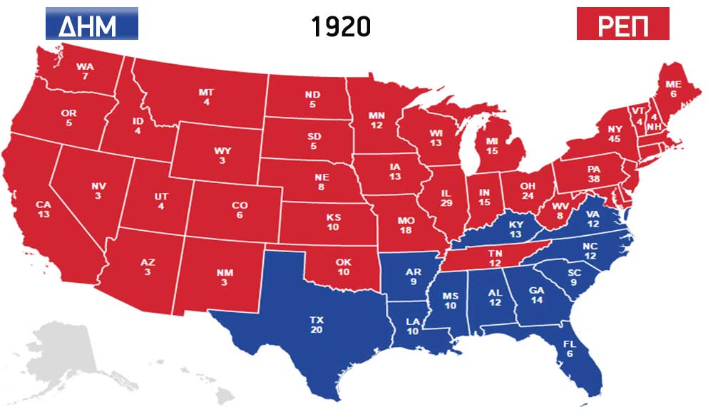 1920 Εκλογές 1920. Μεγάλη νίκη των Ρεπουμπλικανών με τον Χάρντινγκ κυρίως λόγω της διογκούμενης κακής οικονομικής κατάστασης αλλά και της αντίθεσης στην πολιτική των Δημοκρατικών για στήριξη της Κοινωνίας των Εθνών. Ο Χάρντινγκ πήρε 60,3% της λαϊκής ψήφου το υψηλότερο ποσοστό από το 1820 (υψηλότερα ποσοστά μόνο ο Ρούσβελτ (1936 – 60,8%), Τζόνσον (1964 – 61,1%) και Νίξον (1972 – 60,7%).