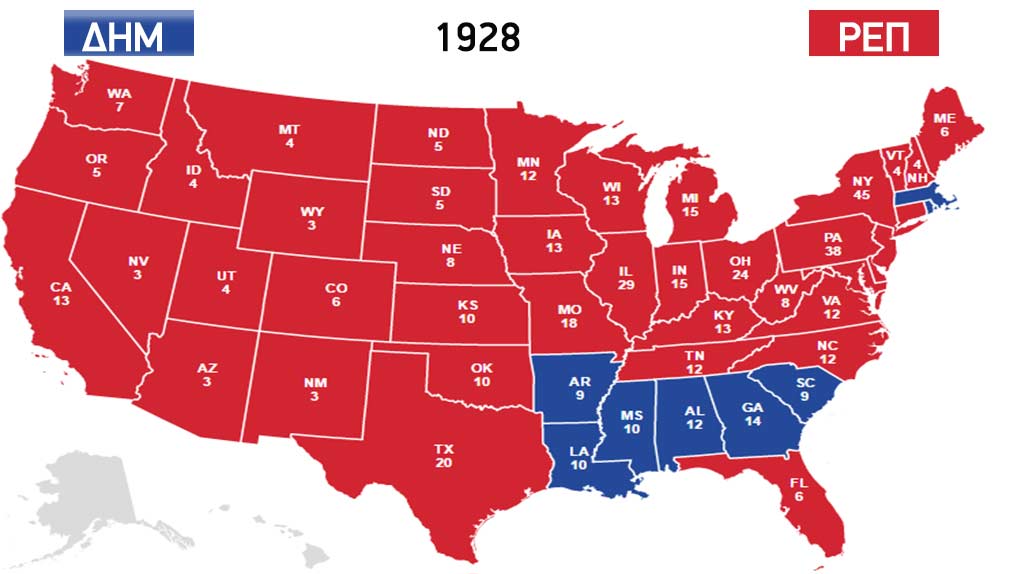 1928 Εκλογές 1928. Νίκη των Ρεπουμπλικανών με τον Χέρμπερτ Χούβερ λόγω της συνεχιζόμενης εκτόξευσης της οικονομίας και της θέλησης των πολιτών να συνεχίσει αυτή η πορεία. Οι Δημοκρατικοί με τον Σμίθ κράτησαν μόνο τις πολιτείες του πυρήνα του Νότου. Χαρακτηριστικό αυτής της εκλογικής μάχης είναι ότι και οι δύο υποψήφιοι στηρίχτηκαν από τα κόμματά τους με κρύα καρδιά.