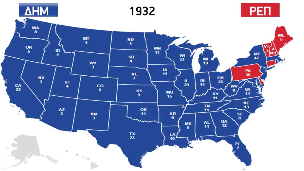 1932 Εκλογές 1932. Μεγάλη νίκη των Δημοκρατικών με τον Φρανγκλίνο Ρούζβελτ (μακρινό συγγενή του Θεόδωρου Ρούζβελτ) καθώς το μεγάλο κραχ του 1929 και η μεγάλη οικονομική και κοινωνική καταστροφή χρεώθηκαν στους Ρεπουμπλικανούς (οι οποίοι είχαν κερδίσει τις 2 προηγούμενες εκλογές λόγω τους συνεχούς ανάπτυξης της οικονομίας μέχρι που κατάντησε φούσκα). Ο Ρούζβελτ ξεκίνησε την πολιτική της ‘Νέας Συμφωνίας – New Deal’ που μετέτρεψε τους Δημοκρατικούς σε ‘Φιλελεύθερους – Liberals’ (και τους Ρεπουμπλικάνους σε ‘Συντηρητικούς’) και που τους χάρισε 7 νίκες στις επόμενες 9 εκλογικές αναμετρήσεις μέχρι και το 1964.