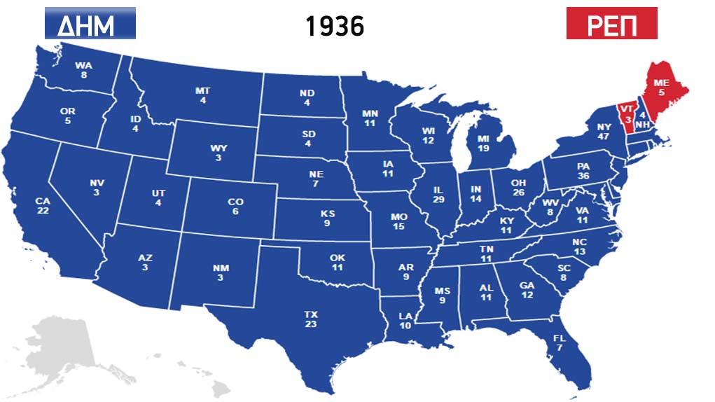 1936 Εκλογές 1936. Ακόμη πιο μεγάλη νίκη των Δημοκρατικών με τον Ρούζβελτ καθώς η πολιτική του ‘New Deal’, με την επέκταση της κοινωνικής ασφάλισης και των επιδομάτων ανεργίας, κέρδισε τους πολίτες. Οι Δημοκρατικοί πετυχαίνουν την μεγαλύτερη νίκη τους μετά το 1950 με το Ρούζβελτ να παίρνει από τους 531 εκλέκτορες τους 523 και όλες τις πολιτείες εκτός από το Μέιν και το Βερμόντ.