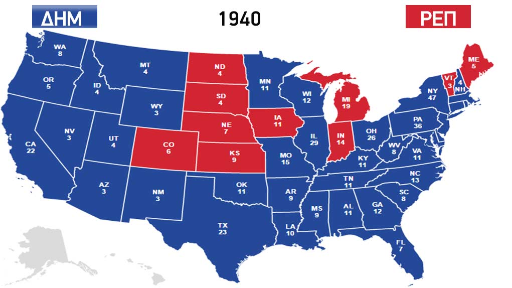 1940 Εκλογές 1940. Με τον Β’ Παγκόσμιο Πόλεμο να δυναμώνει στην Ευρώπη οι Δημοκρατικοί κερδίζουν και πάλι με τον Φ. Ρούσβελτ ο οποίος είναι ο πρώτος – και ο τελευταίος – πρόεδρος στην ιστορία των ΗΠΑ που έσπασε την παράδοση και έβαλε υποψηφιότητα και εκλέχθηκε για 3η φορά (και για 4η φορά το 1944). Αν και ο ίδιος ήθελε τις ΗΠΑ να βγουν στο πόλεμο υποσχέθηκε προεκλογικά ότι αν τον ξαναψηφίσουν η χώρα δεν θα συμμετάσχει σε πόλεμο. Η επίθεση όμως των Ιαπώνων στο Πέρλ Χάρμπορ μετέστρεψε την κοινή γνώμη.