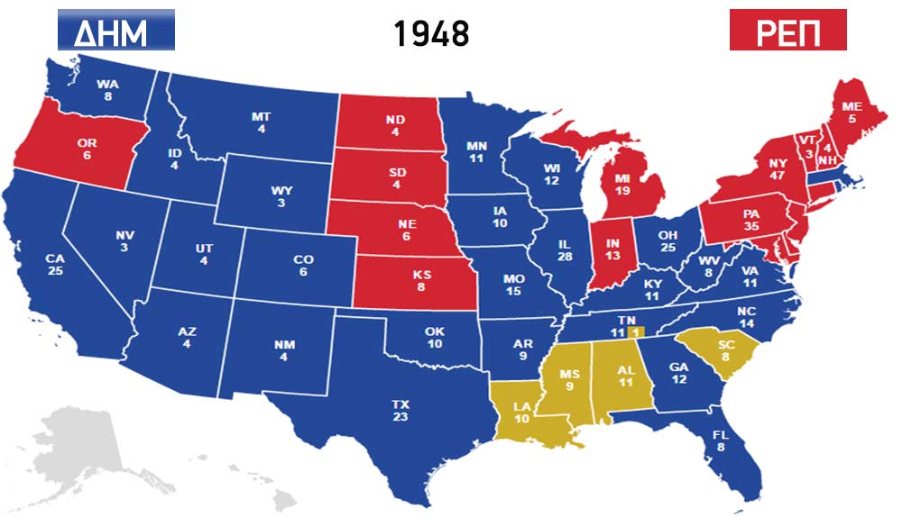 1948 Εκλογές 1948. Η νέα νίκη των Δημοκρατικών (η 5η συνεχής) με τον Τρούμαν αποτέλεσε την μεγαλύτερη εκλογική έκπληξη στην αμερικανική πολιτική ιστορία καθώς όλοι (και οι δημοσκοπήσεις) προέβλεπαν νίκη του Ρεπουμπλικανού Ντιούι. Ο Τρούμαν εκτός από τους λευκούς νότιους, τους καθολικούς, εβραίους κλπ, κατόρθωσε να συσπειρώσει ακόμα και τους αγρότες των μεσοδυτικών πολιτειών, και να αντέξει τη διαίρεση του Δημοκρατικού κόμματος. Χαρακτηριστικό είναι το γεγονός ότι οι περισσότεροι συνεργάτες του είχαν αρχίσει να βρίσκουν δουλειές αλλού, ο ίδιος το βράδυ των εκλογών πήγε για ύπνο σίγουρος ότι χάνει, ενώ όλες οι εφημερίδες ετοίμαζαν πρωτοσέλιδα ήττας του Τρούμαν. Ηταν οι πρώτες εκλογές που η τηλεόραση έπαιξε σημαντικό ρόλο με 350.000 συσκευές και 27 σταθμούς στη χώρα.