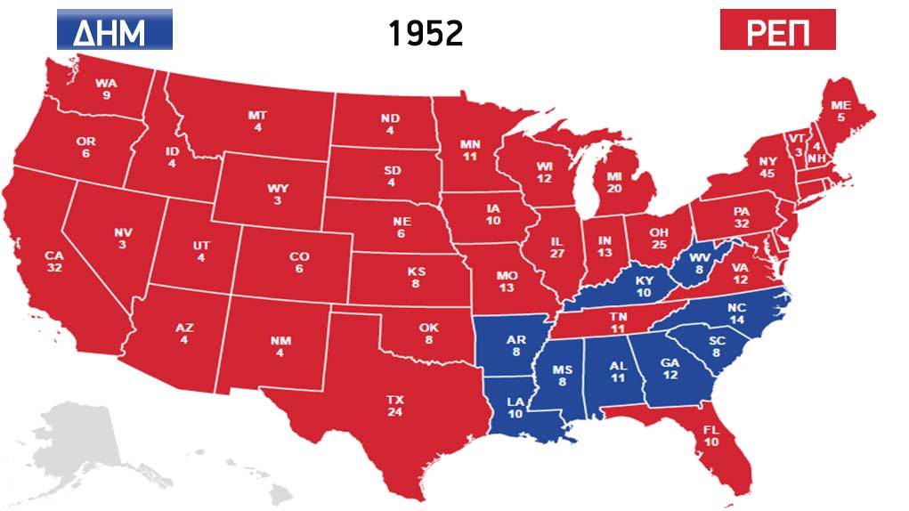 1952 Εκλογές 1952. Νίκη των Ρεπουμπλικανών με τον Ντουάιτ Αιζενχάουερ, ήρωα του Β΄ Παγκοσμίου Πολέμου, εν μέσω του Ψυχρού Πολέμου, του αντικομμουνισμού (Μακάρθυ) και του πολέμου στη Κορέα τερματίζοντας έτσι το σερί των επί 20 χρόνια Δημοκρατικών νικών. Αντιπρόεδρός του ο Ρίτσαρντ Νίξον.Το ενδιαφέρον είναι ότι πριν τις εκλογές ο πρόεδρος Τρούμαν είχε ζητήσει από τον Αιζενχάουερ να ηγηθεί του Δημοκρατικού κόμματος, πράγμα όμως που ο Άικ αρνήθηκε.