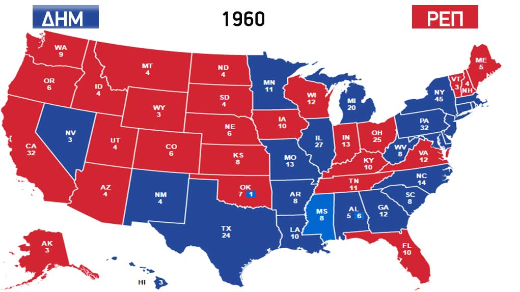 1960 Εκλογές 1960. Νίκη των Δημοκρατικών με τον Τζόν Κένεντι, τον νεαρότερο και πιο χαρισματικό πρόεδρο των ΗΠΑ, ο οποίος διάλεξε αμέσως για αντιπρόεδρό του τον Λίντον Τζόνσον τον ισχυρότερο αντίπαλό του για το χρίσμα των Δημοκρατικών. Ο Κένεντι θεωρείται ότι κέρδισε τα πρώτα εκλογικά τηλεοπτικά debates τόσο εσωκομματικά με τον Τζόνσον όσο και στις προεδρικές με τον Νίξον, ο οποίος ενώ έχασε και τις εκλογές για κυβερνήτης της Καλιφόρνια το 1962, κατόρθωσε να κερδίσει τις προεδρικές του 1968. Στις εκλογές του 1960 ψήφισαν και οι δύο τελευταίες περιοχές που έγιναν πολιτείες, η Αλάσκα και η Χαβάη. Ο Κένεντι δολοφονήθηκε στις 22 Νοεμβρίου 1963.