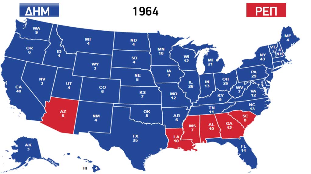 1964 Εκλογές 1964. Μεγάλη νίκη των Δημοκρατικών με τον Λίντον Τζόνσον ο οποίος κατόρθωσε να πάρει το υψηλότερο ποσοστό των ψήφων του αμερικάνικου λαού από το 1820 μέχρι σήμερα (61,1%). Το Δημοκρατικό κόμμα με τον Τζόνσον ολοκλήρωσε την στροφή του γενόμενο ένα δημοφιλές σύγχρονο προοδευτικό φιλολαϊκό αντιρατσιστικό κόμμα, ότι δηλαδή ήταν κάποτε το Ρεπουμπλικανικό το οποίο πλέον έχει καταντήσει πολύ συντηρητικό. Χαρακτηριστικό το γεγονός ότι ο υποψήφιος του Ρεπουμπλικανικού Γκολντγουότερ ψηφίστηκε ιδιαίτερα σε περιοχές του βαθέος «ρατσιστικού» Νότου που μέχρι πρίν ήταν φρούρια των Δημοκρατικών.