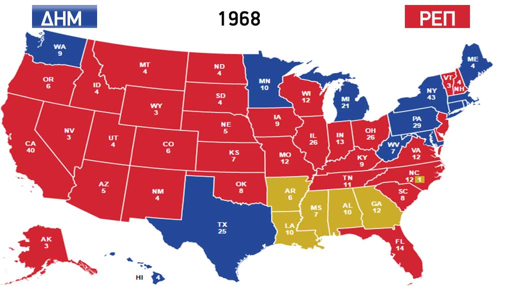 1968 Εκλογές 1968. Νίκη των Ρεπουμπλικανών με τον Ρίτσαρντ Νίξον καθώς χρεώθηκε στους Δημοκρατικούς η κλιμάκωση του πολέμου του Βιετνάμ . Η χρονιά των εκλογών σημαδεύτηκε από τις διαδηλώσεις και τις φοιτητικές αντιδράσεις κατά του πολέμου, αλλά και από τις δολοφονίες του Μάρτιν Λούθερ Κίνγκ και του Ρόμπερτ Κένεντι. Με την νίκη των Ρεπουμπλικανών λήγει και η πολιτική του «Νιου Ντιλ» που κυριάρχισε επί 36 χρόνια.