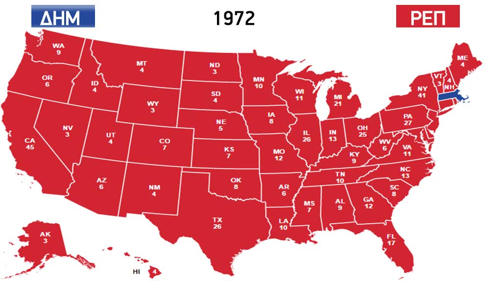 1972 Εκλογές 1972. Νέα πολύ μεγάλη νίκη των Ρεπουμπλικανών με τον Νίξον που τόνισε τη πρόθεσή του να σταματήσει τον πόλεμο του Βιετνάμ, το άνοιγμά του στην Κίνα και την επιτυχή οικονομική πολιτική του. Όμως η δεύτερη προεδρική του θητεία (αλλά και του αντιπροέδρου του ελληνοαμερικανού Σπύρου Αγκνιου) θα τελειώσει άδοξα. Το 1973 ο Άγκνιου παραιτείται κατηγορούμενος για δωροδοκία και το 1974 ακολουθεί ο Νίξον λόγω του σκανδάλου των παράνομων παρακολουθήσεων Γουότεργκέιτ. Ψηφίζουν οι 18άρηδες.