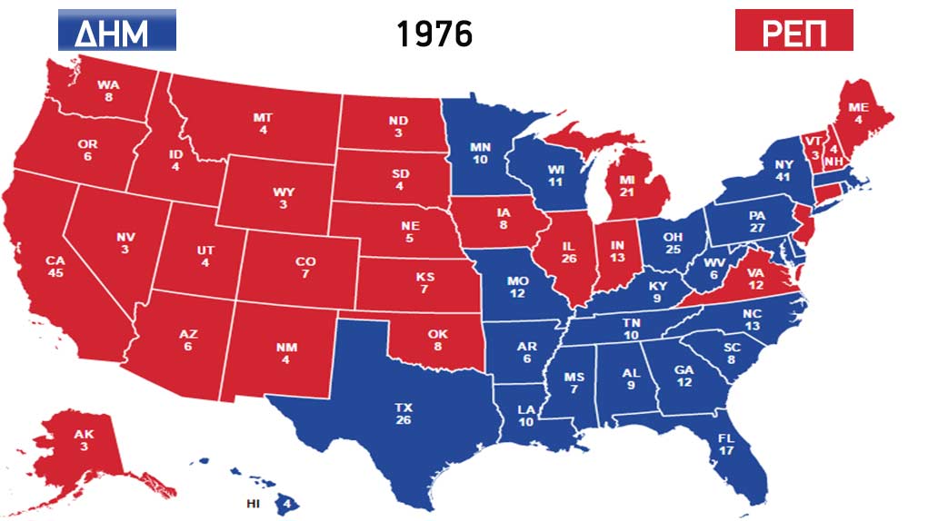 1976 Εκλογές 1976. Οριακή νίκη των Δημοκρατικών με τον Τζίμι Κάρτερ τον πρώτο πρόεδρο που εκλέγεται από το βαθύ Νότο (Τζόρτζια) από το 1848. Οι Ρεπουμπλικανοί με τον Τζέραλντ Φoρντ (πήρε το χρίσμα του κόμματος νικώντας οριακά τον Ρόναλντ Ρέιγκαν) πλήρωσαν το Γουότεργκέιτ, τη πτώση του Νότιου Βιετνάμ και την επιδεινούμενη οικονομία.