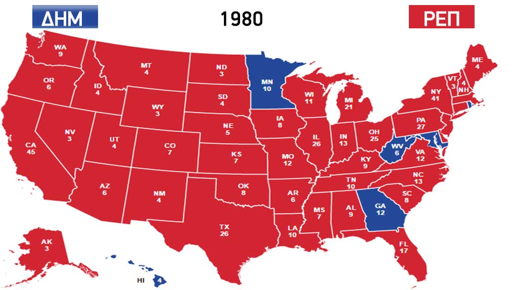 1980 Εκλογές 1980. Μεγάλη νίκη των Ρεπουμπλικανών με τον Ρόναλντ Ρίγκαν που ενισχύθηκε από την χειροτέρευση της οικονομίας επί Κάρτερ και από την αποτυχημένη προσπάθεια διάσωσης των αμερικανικών ομήρων στο Ιράν. Ο Ρίγκαν πήρε τους περισσότερους εκλέκτορες στην ιστορία για πρωτοεμφανιζόμενο πρόεδρο.