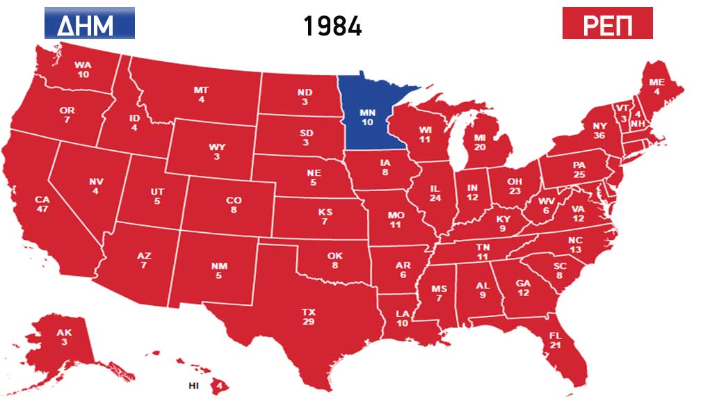 1984 Εκλογές 1984. Η δεύτερη μεγαλύτερη νίκη των Ρεπουμπλικανών στην ιστορία (μαζί με αυτή του Νίξον το 1972) κερδίζοντας τις 49 από τις 50 πολιτείες. Τον Ρίγκαν ψήφισαν περισσότεροι εκλέκτορες από οποιοδήποτε άλλο πρόεδρο στην ιστορία (525 από σύνολο 538) Η νίκη οφείλεται κυρίως στη επιτυχημένη οικονομική πολιτική του που ονομάστηκε «Ριγκανόμικς».