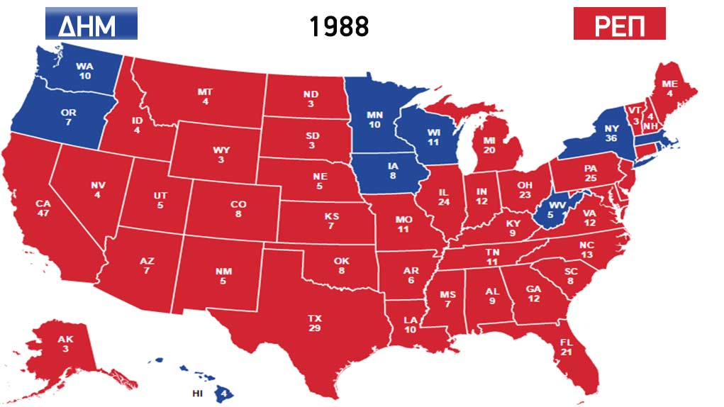1988 Εκλογές 1988. Νέα νίκη των Ρεπουμπλικανών με τον Τζορτζ Μπους (πατέρα) έχοντας ήδη δύο θητείες αντιπρόεδρος του Ρίγκαν. Ο Μπους νίκησε τον υποψήφιο των Δημοκρατικών ελληνοαμερικανικό Μάικλ Δουκάκη στηριζόμενος στην καλή πορεία της οικονομίας, στη μη ανάμιξη της Αμερικής σε πόλεμο (μέχρι τότε) και στη δημοφιλία του απερχόμενου Ρέιγκαν. Ο Μπους ήταν ο μόνος αντιπρόεδρος μετά τον Βαν Μπούρεν το 1836, που κατόρθωσε αμέσως μετά τη θητεία του να γίνει πρόεδρος .