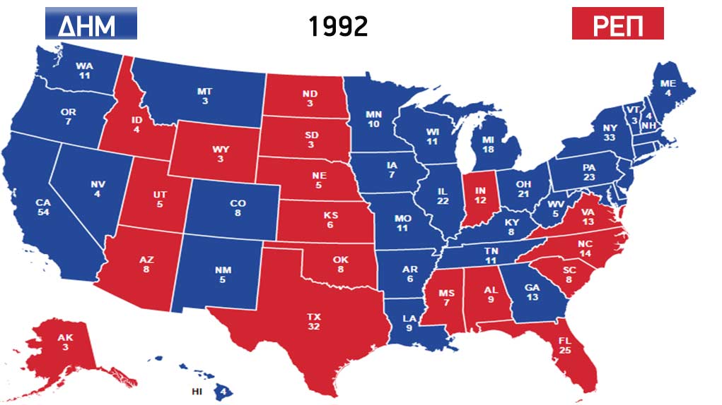1992 Εκλογές 1992. Νίκη των Δημοκρατικών με τον Μπίλ Κλίντον καθώς ο Μπους δεν τήρησε την υπόσχεσή του για μείωση των φόρων ενώ δεν κεφαλαιοποίησε την απελευθέρωση του Κουβέιτ από το Ιράκ (πόλεμος του Κόλπου), την διάλυση της Σοβιετικής Ένωσης και την πτώση του Τείχους. Ο Κλίντον κατάφερε με σκληρό αγώνα να κερδίσει το χρίσμα του Δημοκρατικού κόμματος και να επιλέξει για αντιπρόεδρο τον επίσης νεαρό συνυποψήφιό του Αλ Γκορ ( οι σαραντάρηδες).