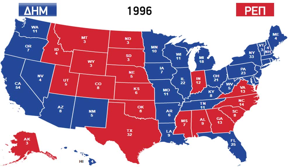 1996 Εκλογές 1996. Νέα νίκη των δημοκρατικών παρά το γεγονός ότι είχαν ήδη χάσει την Βουλή (πρώτη φορά σε 40 χρόνια) και την Γερουσία. Ο Κλίντον ήταν ο αδιαφιλονίκητος ηγέτης καθώς η οικονομία ήταν στα καλύτερά της από την εποχή του Αιζενχάουρ τη δεκαετία του ’50, ενώ και η διεθνής κατάσταση ήταν σχετικά καλή.
