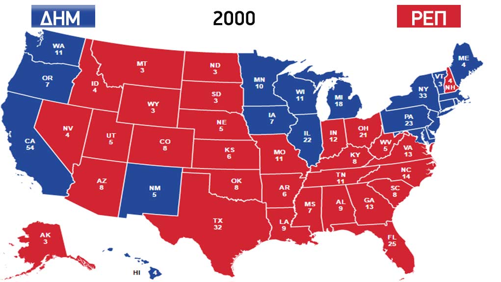 2000 Εκλογές 2000. Οριακή νίκη (η πιο οριακή από 1876) των Ρεπουμπλικάνων με τον Τζορτζ Μπους (υιό) εν μέσω διαμάχης των δύο κομμάτων για τις ψήφους στην Φλόριντα (έγινε επανακαταμέτρηση που διακόπηκε με απόφαση του Ανωτάτου Δικαστηρίου της χώρας). Ιστορικά, ήταν η 4η εκλογική αναμέτρηση που το εκλεγέν πρώτο κόμμα πήρε λιγότερες ψήφους πολιτών από το 2ο κόμμα (λόγω του έντονα πλειοψηφικού συστήματος) .