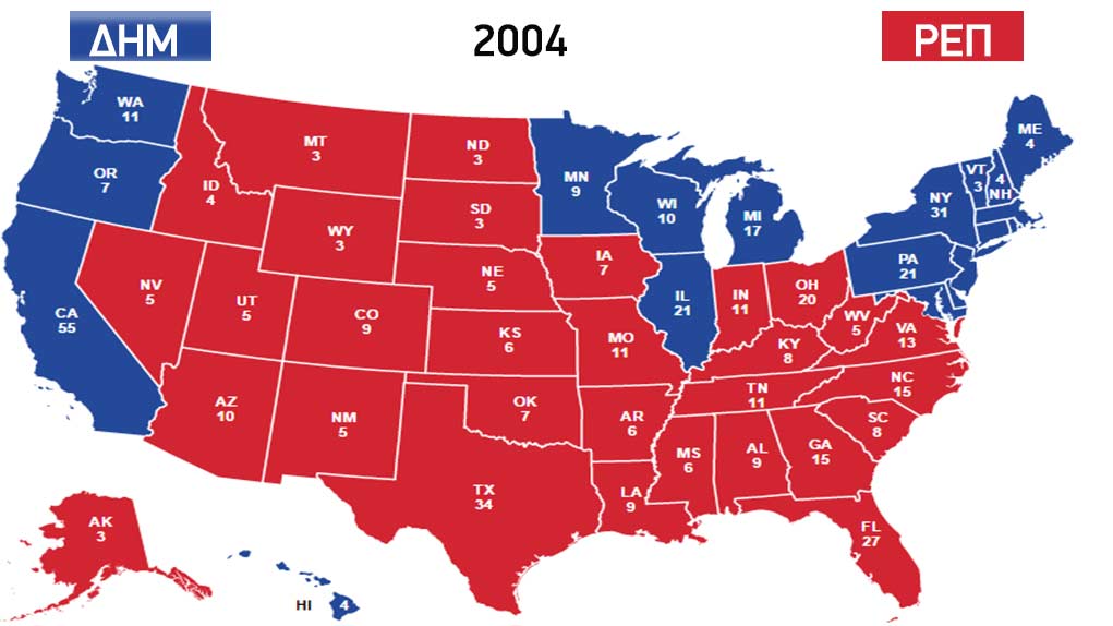 2004 Εκλογές 2004. Νίκη και πάλι με σχετικά μικρή διαφορά των Ρεπουμπλικανών, με τον Μπους να κεφαλαιοποιεί τις διεθνείς εξελίξεις (εξωτερική πολιτική), τον πόλεμο κατά της τρομοκρατίας και την εισβολή στο Ιράκ το 2003. Η νίκη του Μπους ήταν ιστορικά ή με μικρότερη διαφορά στην λαϊκή ψήφο για αμέσως επανεκλεγόμενο πρόεδρο.