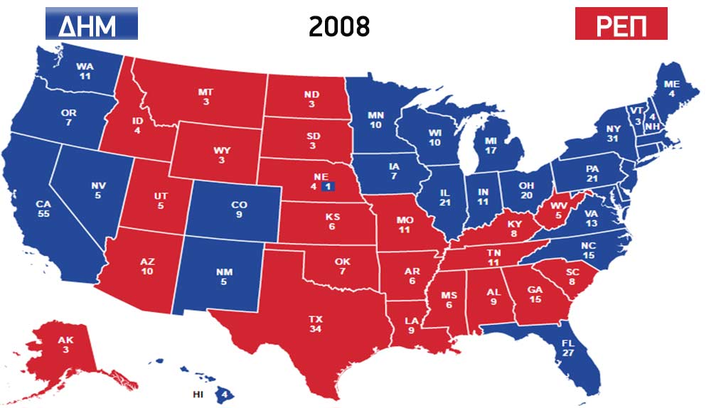 2008 Εκλογές 2008. Σημαντική νίκη των Δημοκρατικών με τον πρώτο στην ιστορία Αφροαμερικανό πρόεδρο τον Μπαράκ Ομπάμα. Η συμμετοχή των πολιτών ήταν η μεγαλύτερη των τελευταίων 40 ετών και ο Ομπάμα έλαβε τις περισσότερες ψήφους (69,5 εκατομμύρια) από οποιονδήποτε άλλον υποψήφιο πρόεδρο στην ιστορία. Οι αμερικανοί θέλανε αλλαγή κυρίως λόγω της οικονομικής κρίσης και ύφεσης και του πολέμου του Ιράκ.