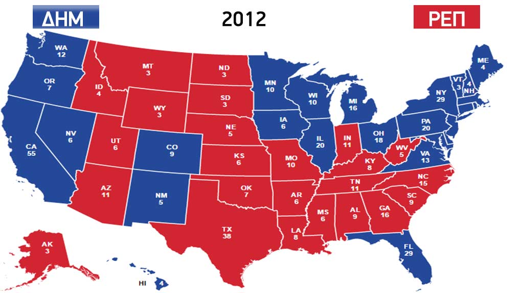 2012 Εκλογές 2012. Νίκη των Δημοκρατικών με επανεκλογή του Ομπάμα αν και με λιγότερες ψήφους από ότι το 2008 (ο 2ος πρόεδρος μετά τον Γουίλσον το 1916 που εκλέγεται την 2η φορά με λιγότερες ψήφους από την 1η). Προεκλογικός αγώνας μεταξύ Ομπάμα και Ρόμνι με πολλά θέματα: οικονομικά, φορολογικά, περιβαλλοντικά, πυρηνικά του Ιράν, Αραβική Άνοιξη, κλπ.