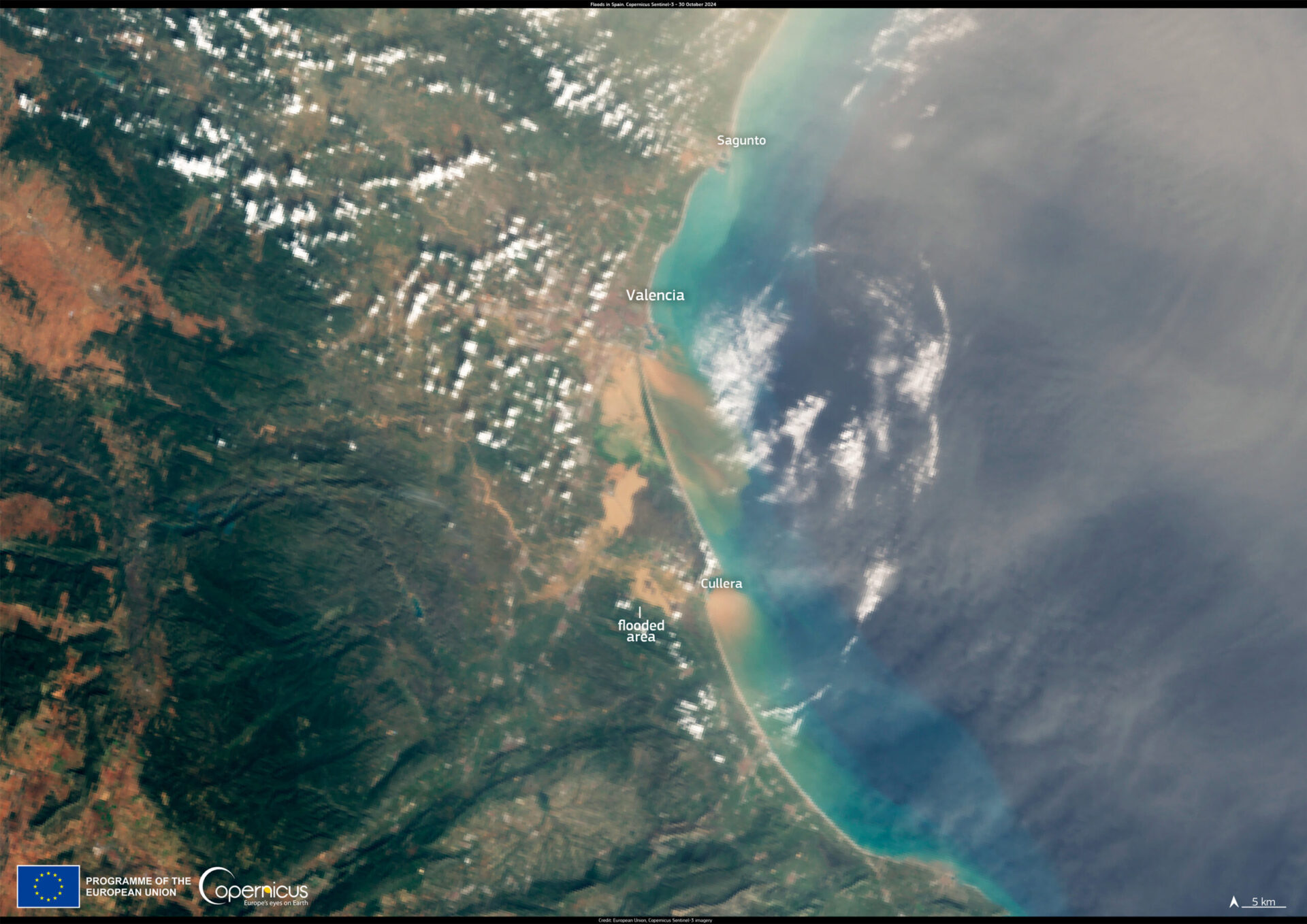 Δραματική μεταμόρφωση του τοπίου, επιβεβαιώνουν και οι δορυφορικές εικόνες από τη Βαλένθια όπου μέσα σε μόλις οκτώ ώρες έπεσε βροχή που αντιστοιχεί σε ένα χρόνο. Ο Ευρωπαϊκός Οργανισμός Διαστήματος (ESA) έχει ενεργοποιήσει την υπηρεσία ταχείας χαρτογράφησης έκτακτης ανάγκης Copernicus για την παροχή δορυφορικών εικόνων που «μιλούν» από μόνες τους.