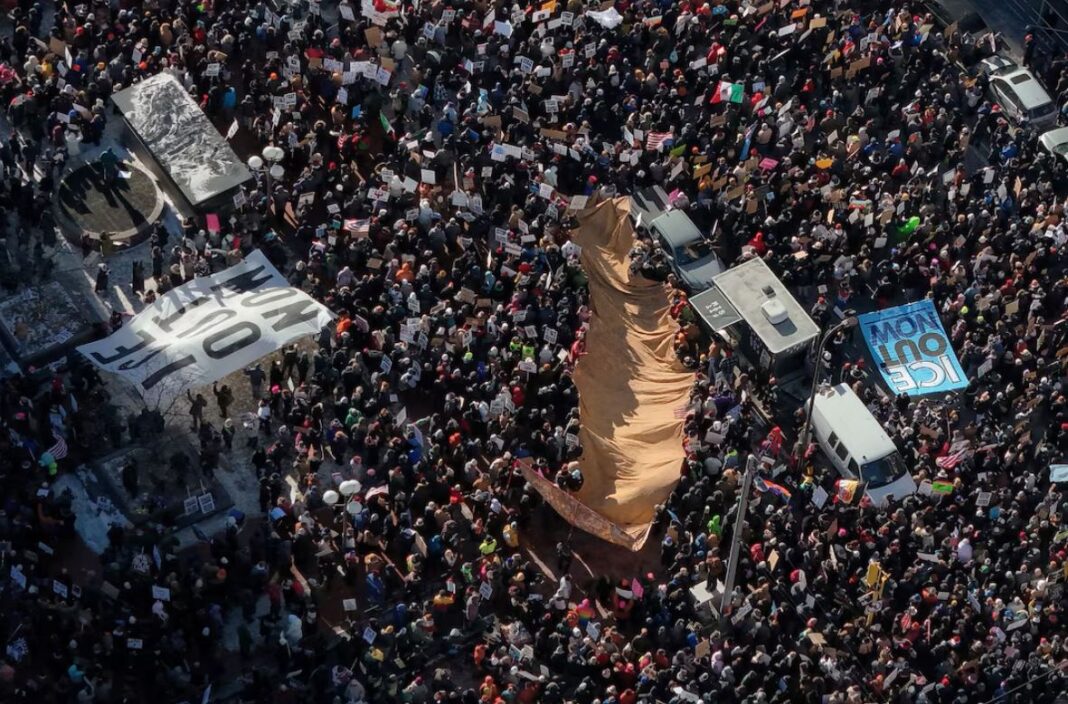 Διαμαρτυρόμενοι για την ανάπτυξη και τις τακτικές που χρησιμοποιεί η αστυνομία μετανάστευσης ICE, χιλιάδες άνθρωποι συγκεντρώθηκαν στο κέντρο της Μινεάπολης παρά το έντονο κρύο, μεταξύ των οποίων οικογένειες με μικρά παιδιά, ζευγάρια ηλικιωμένων και νεαροί ακτιβιστές.