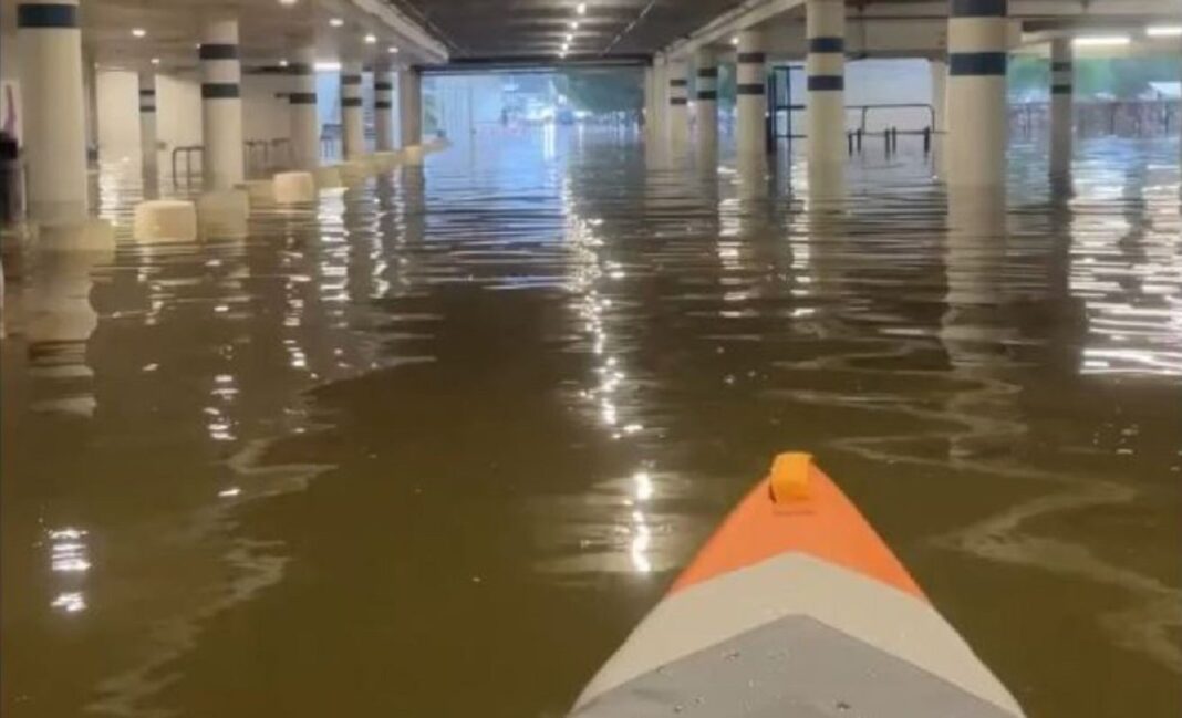 Βίντεο με έναν άνδρα να κινείται με καγιάκ στο πλημμυρισμένο πάρκινγκ καταστήματος E.Leclerc στο Σομίρ (Μαιν-ε-Λουάρ) κάνουν τον γύρο των social media, την ώρα που η δυτική Γαλλία δοκιμάζεται από σφοδρές πλημμύρες.