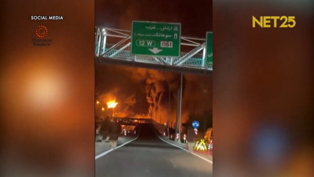 🚨 NEW VIDEO: The Tehran oil depot is completely engulfed in flames — massive fireballs and thick smoke now dominating the skyline as the facility burns out of control. pic.twitter.com/2yZwKqoANT