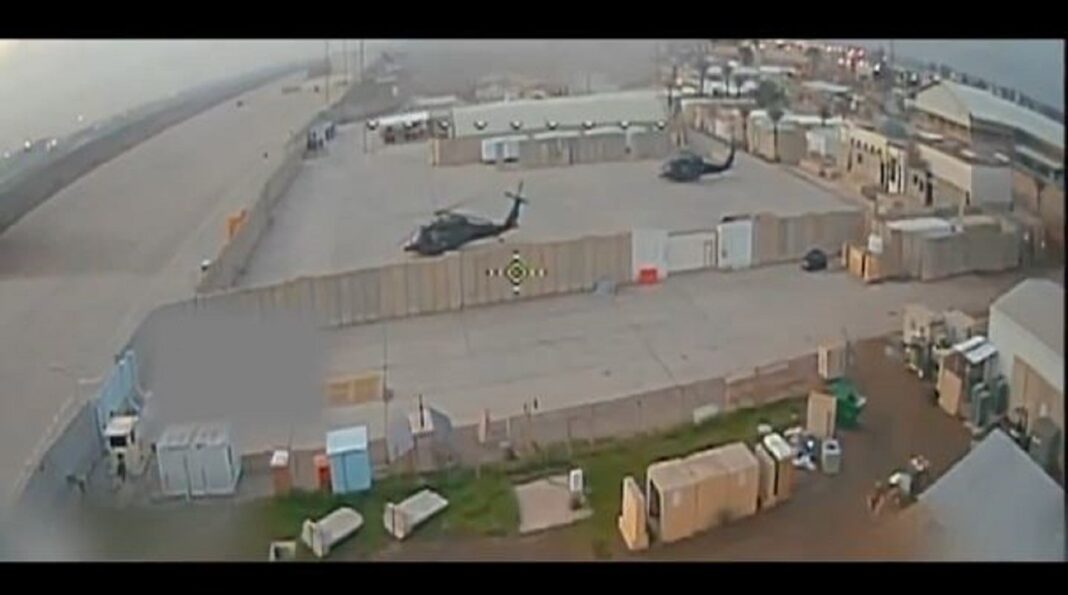 Λίγα δευτερόλεπτα αργότερα, ένα δεύτερο drone εμφανίζεται να διασχίζει τη βάση και να κατευθύνεται προς ένα ελικόπτερο Black Hawk.