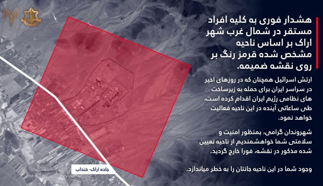 Η εντολή, που δημοσιεύτηκε στον περσικό λογαριασμό X των IDF, καλύπτει «όλα τα άτομα που βρίσκονται στα βορειοδυτικά της πόλης Αράκ και εκείνα που βρίσκονται στη βιομηχανική περιοχή Χεϊραμπάντ στην περιοχή Αράκ».