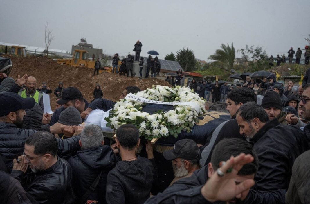 Θρήνος στον Λίβανο, όπου πραγματοποιείται η κηδεία των τριών Λιβανέζων δημοσιογράφων που σκοτώθηκαν σε ισραηλινή επιδρομή.