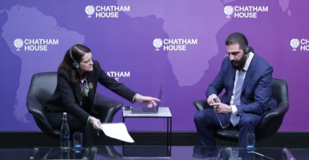 Το περιστατικό σημειώθηκε την Τρίτη, στο πλαίσιο συζήτησης στο Chatham House, όπου ο αλ-Σάρα συνομιλούσε με τη διευθύντρια και διευθύνουσα σύμβουλο του ινστιτούτου, Μπρόνγουεν Μάντοξ.