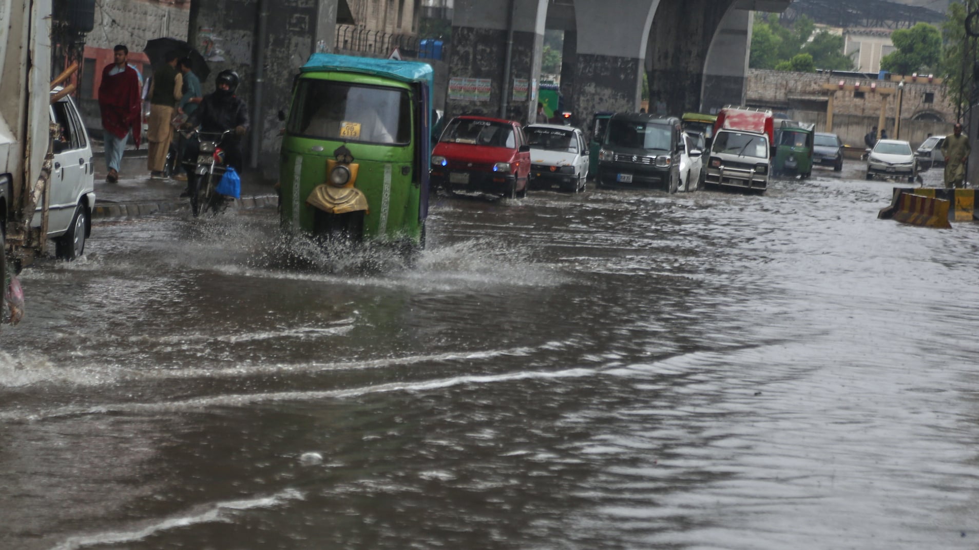 Οχήματα διέρχονται από έναν πλημμυρισμένο δρόμο μετά από έντονες βροχοπτώσεις στο Πεσαβάρ του Πακιστάν, την Τρίτη 7 Απριλίου 2026. (AP Photo/Muhammad Sajjad)