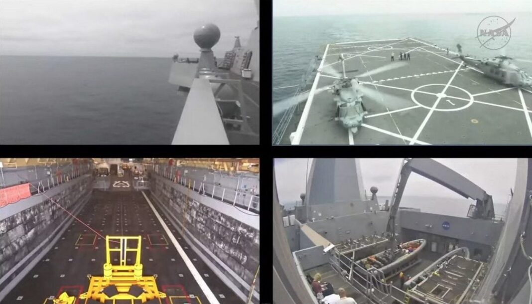 Η προσθαλάσσωση έχει προγραμματιστεί στον Ειρηνικό Ωκεανό, ανοιχτά των ακτών του Σαν Ντιέγκο, στις 5:07 μ.μ. τοπική ώρα (03:07 ώρα Ελλάδας), μετά την οποία η NASA και ο στρατός θα τους βοηθήσουν να βγουν από την κάψουλα και θα τους μεταφέρουν με αεροπλάνο σε πλοίο διάσωσης.